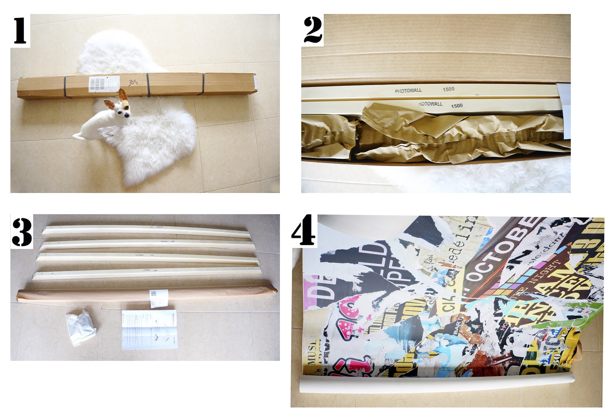 En la primera imagen os muestro como venía todo muy bien embalado cuidadosamente en el paquete, la caja contiene la impresión elegida enrollada en papel de seda, las maderas (de fresno) para armar nuestro marco, los tornillos y demás piezas necesarias con las instrucciones y un colgador.